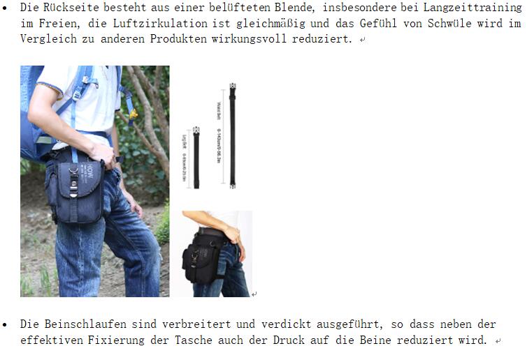 • The belt length can be adjusted in the range of 82-122 cm for optimal wearing comfort. The length of the leg strap can be adjusted between 48 and 88 cm. High-quality zipper is smooth, easy to open and close.